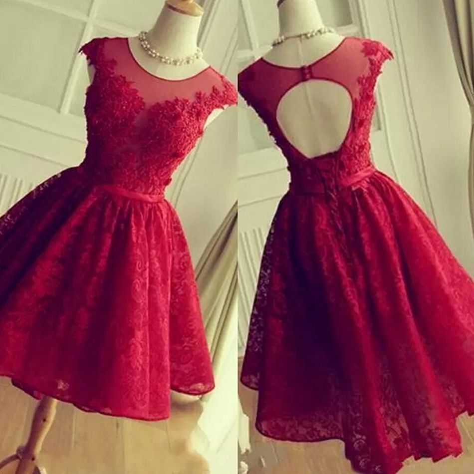 Sheer Jewel Neck Dark Red Homecoming dark red homecoming dresses short